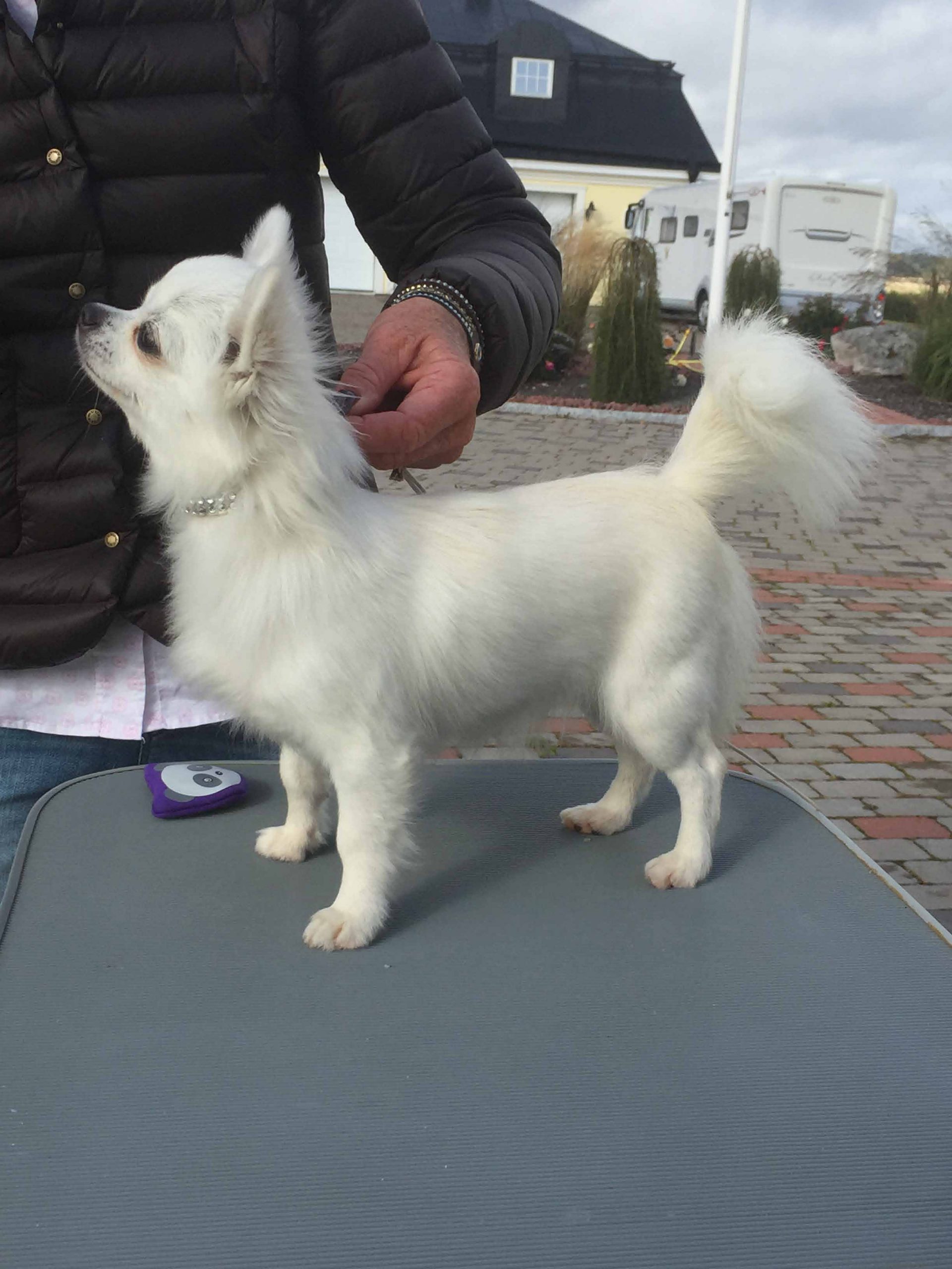 Queen heter jag och är född 2015-03-09 och namnet säger väl det mesta. Jag är väldigt glad i allt, älskar att busa och jag far runt som en stolle ibland. Många säger att jag är en fladder fia och det är nog sant.Utställningar tycker jag otroligt mycket om, kanske för att jag då får utlopp för all glädje o energi.Hoppa högt är något jag gillar att göra och då är jag väldigt glad. Det är jag som är mamma till Kingen, han har jag fostrat i den hårda skolan och det märks säger min mamma, som förresten tycker att jag är den vackraste som finns.